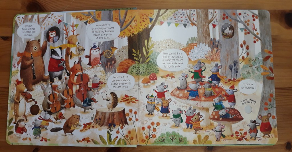 Ce magnifique album cartonné se destine aux enfants à partir de 4 ans. Il permet une première découverte en musique et en images de l’œuvre de Mozart. En appuyant sur les puces sonores, les petits entendent des extraits interprétés par un orchestre composé d’animaux musiciens.