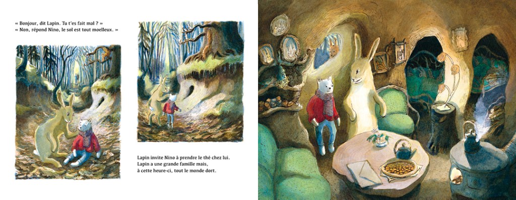 Perdre son doudou est le cauchemar de tous les enfants ! Simon est dans sa poussette bien au chaud sous sa couverture en compagnie de ses parents. Ils font une balade dans la forêt. L’enfant dort alors que ses parents observent la nature. C’est l’automne. Personne ne remarque la chute dans les feuilles mortes de Nino. Heureusement, l’ours en peluche va pouvoir compter sur le soutien des animaux de la forêt. A commencer par Lapin qui s’élance spontanément pour offrir son aide à Nino. Il l’invite à venir prendre le thé chez lui et à déguster un morceau de tarte aux carottes. Nino va ainsi aller à la rencontre de tous les animaux de la forêt se protégeant les uns les autres. Ils lui proposent abri, réconfort et ravitaillement.
